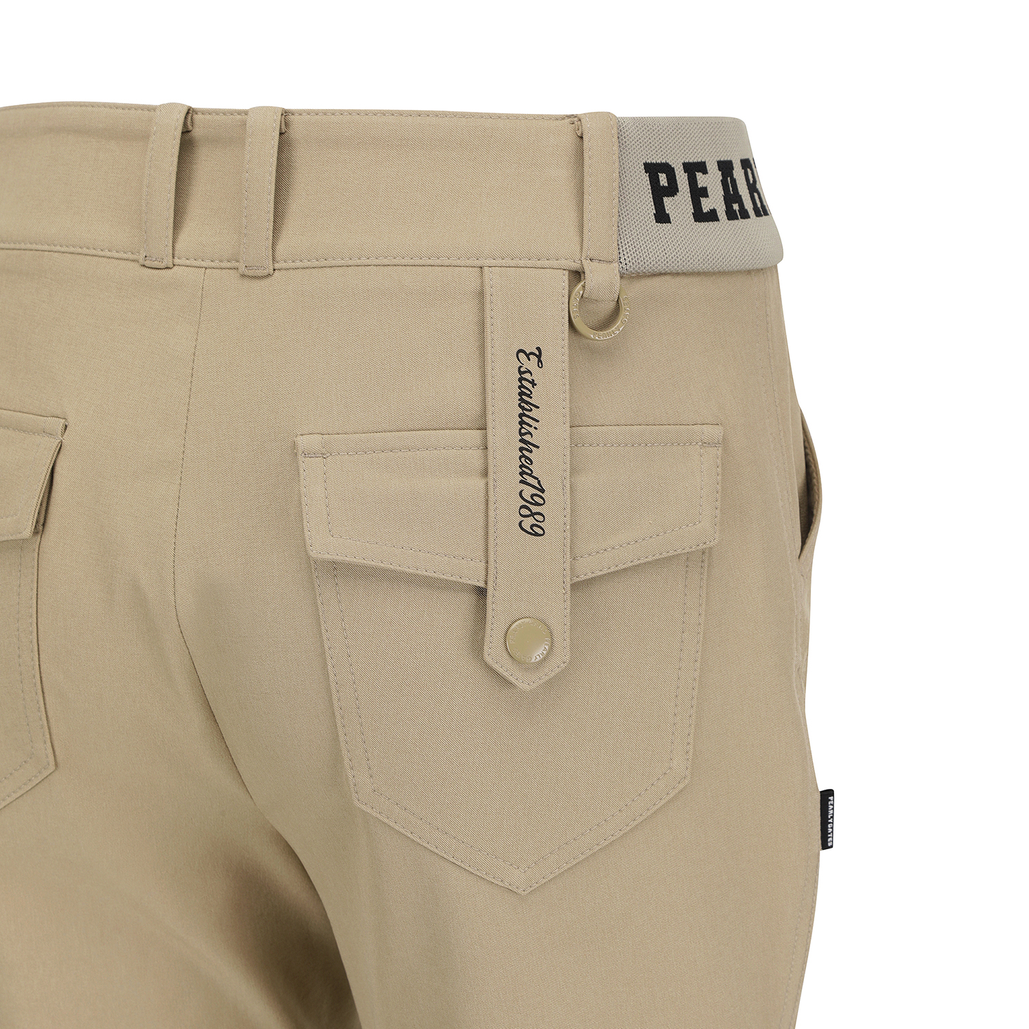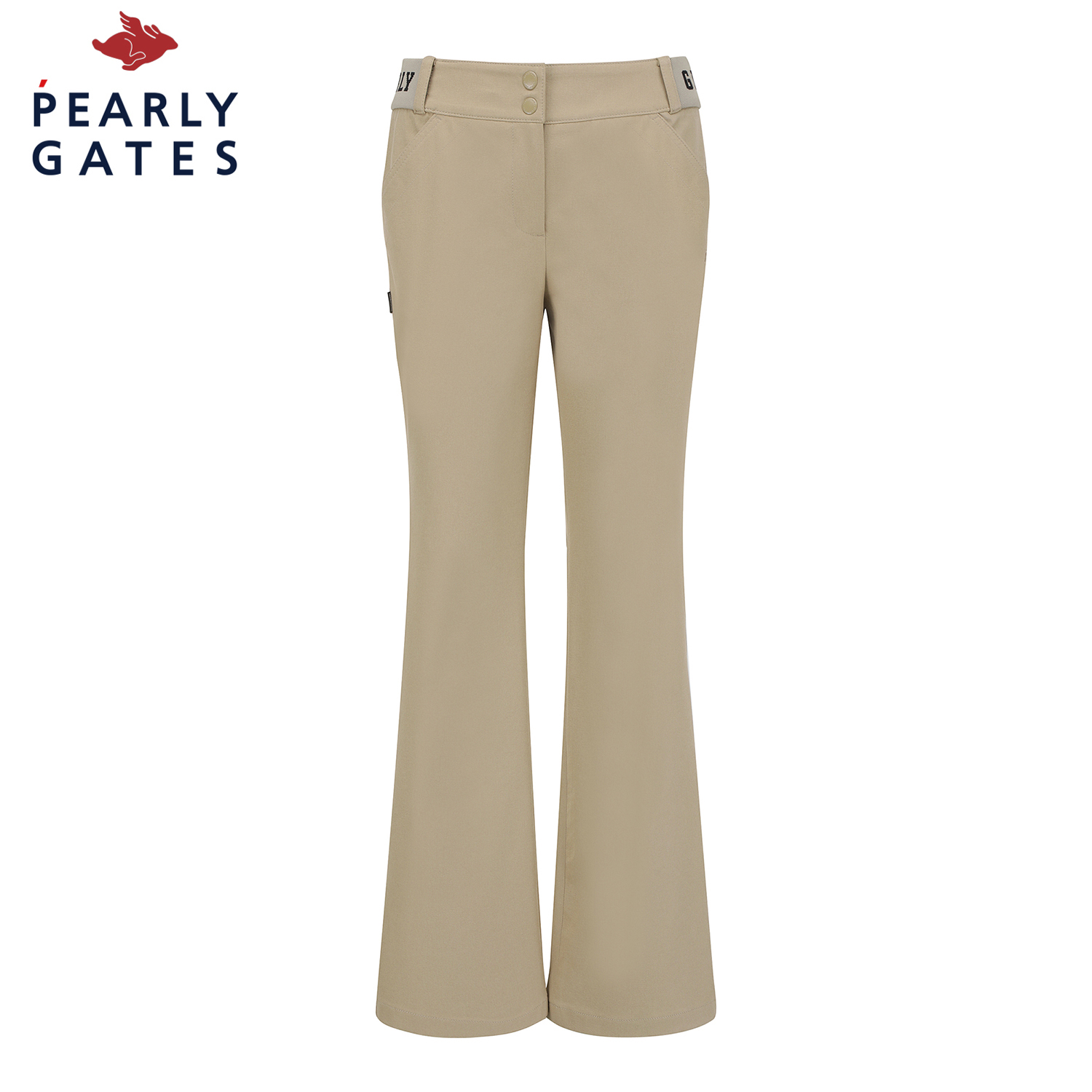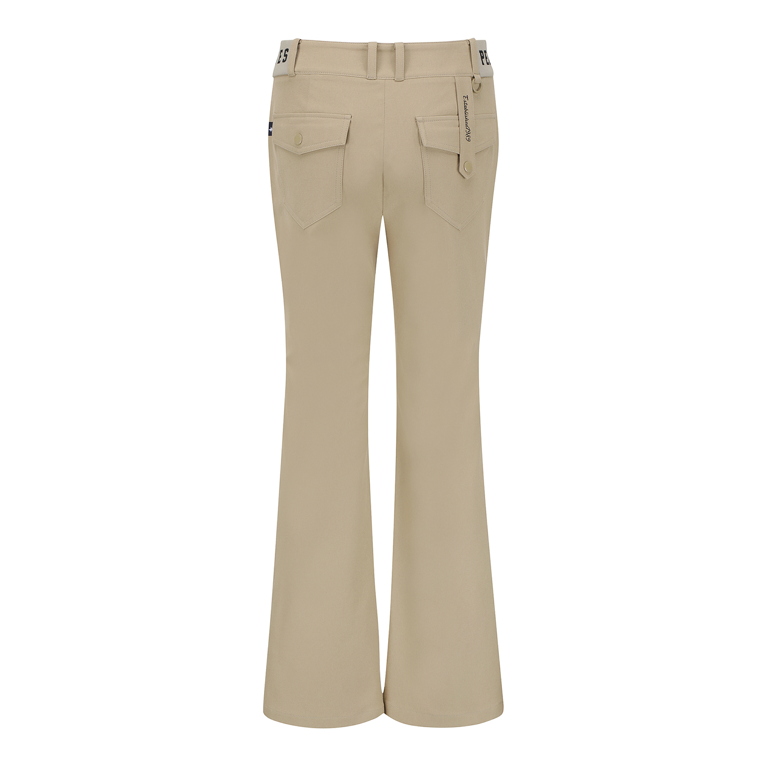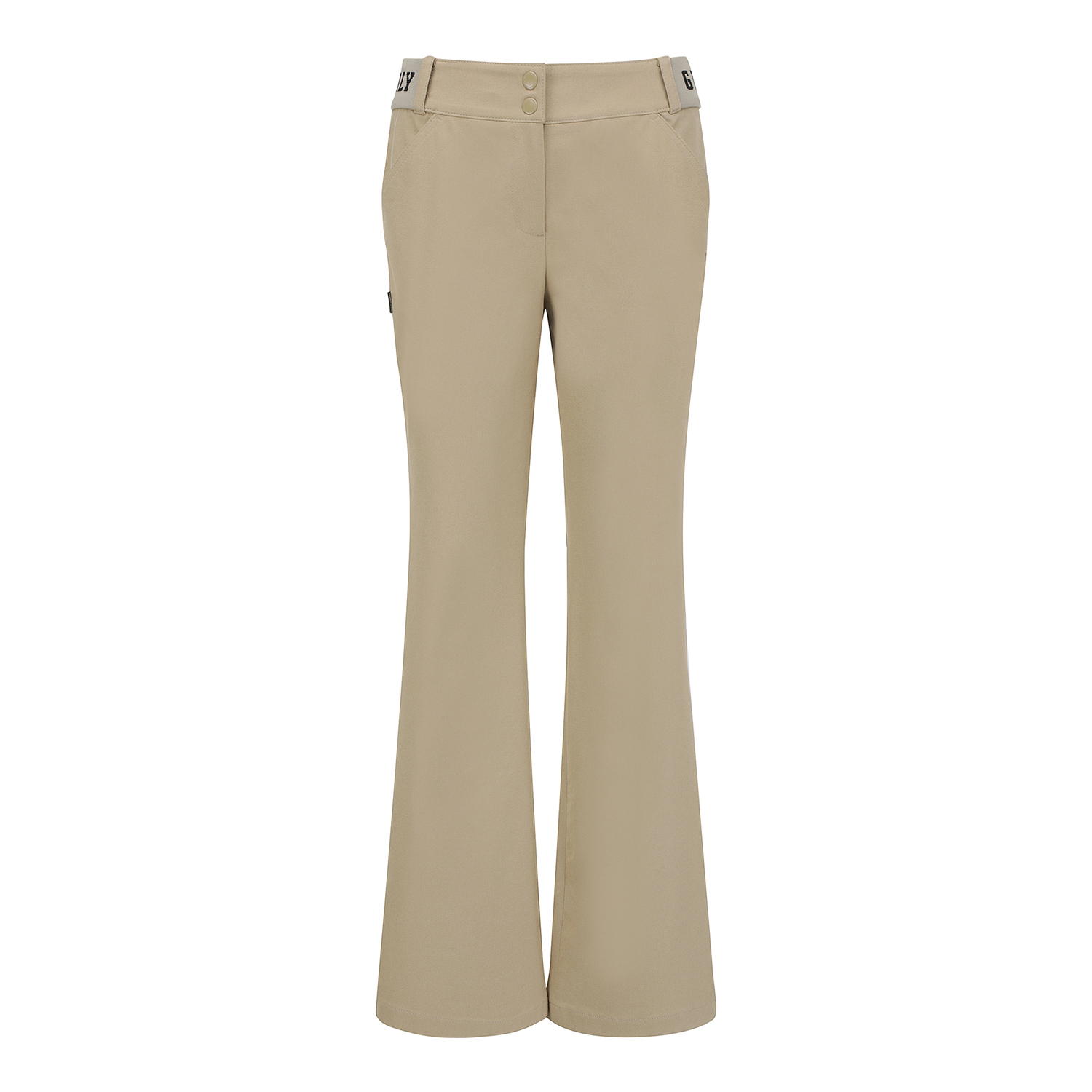 허리 이밴드 부츠컷 팬츠 / 면터치 느낌의 폴리 스판 소재를 사용한 부츠컷 팬츠 / 4WAY 스트레치 원단으로 신축성이 좋음 / 허리 양쪽에 로고 쟈카드 시보리로 착용감이 편안한 아이템