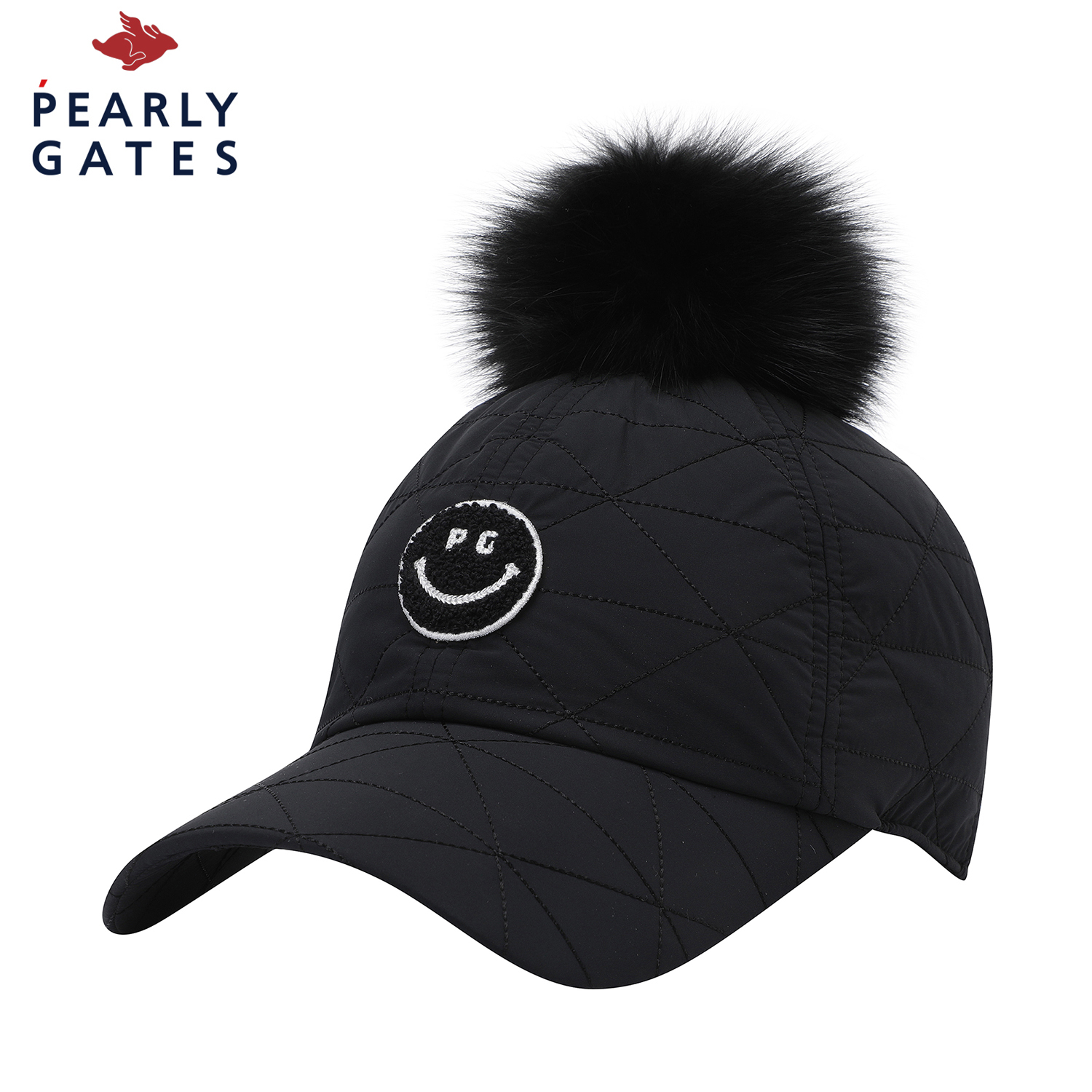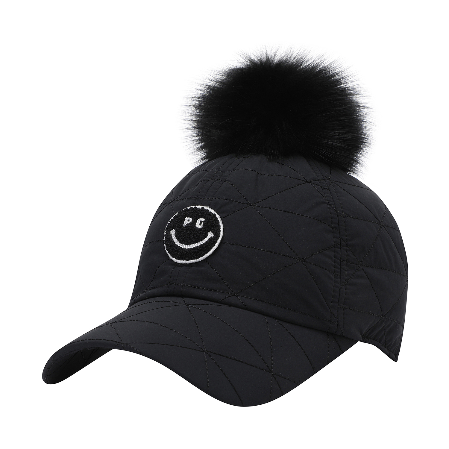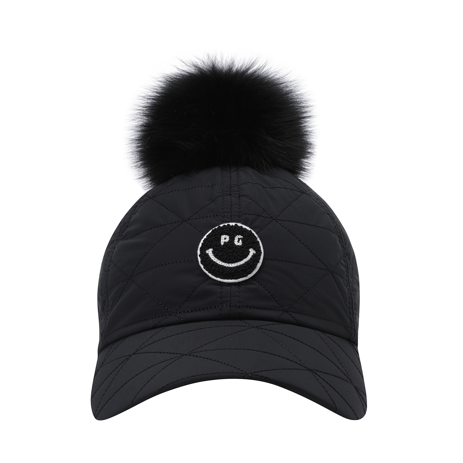 스마일 부클 와펜 포인트 여성 퀼팅 캡.폭스퍼 방울 탈부착 가능.전판 퀼팅 디테일 및 패딩 보강 적용.기모 안감 적용.뒤끈 벨크로 적용.챙길이 : 7.5cm