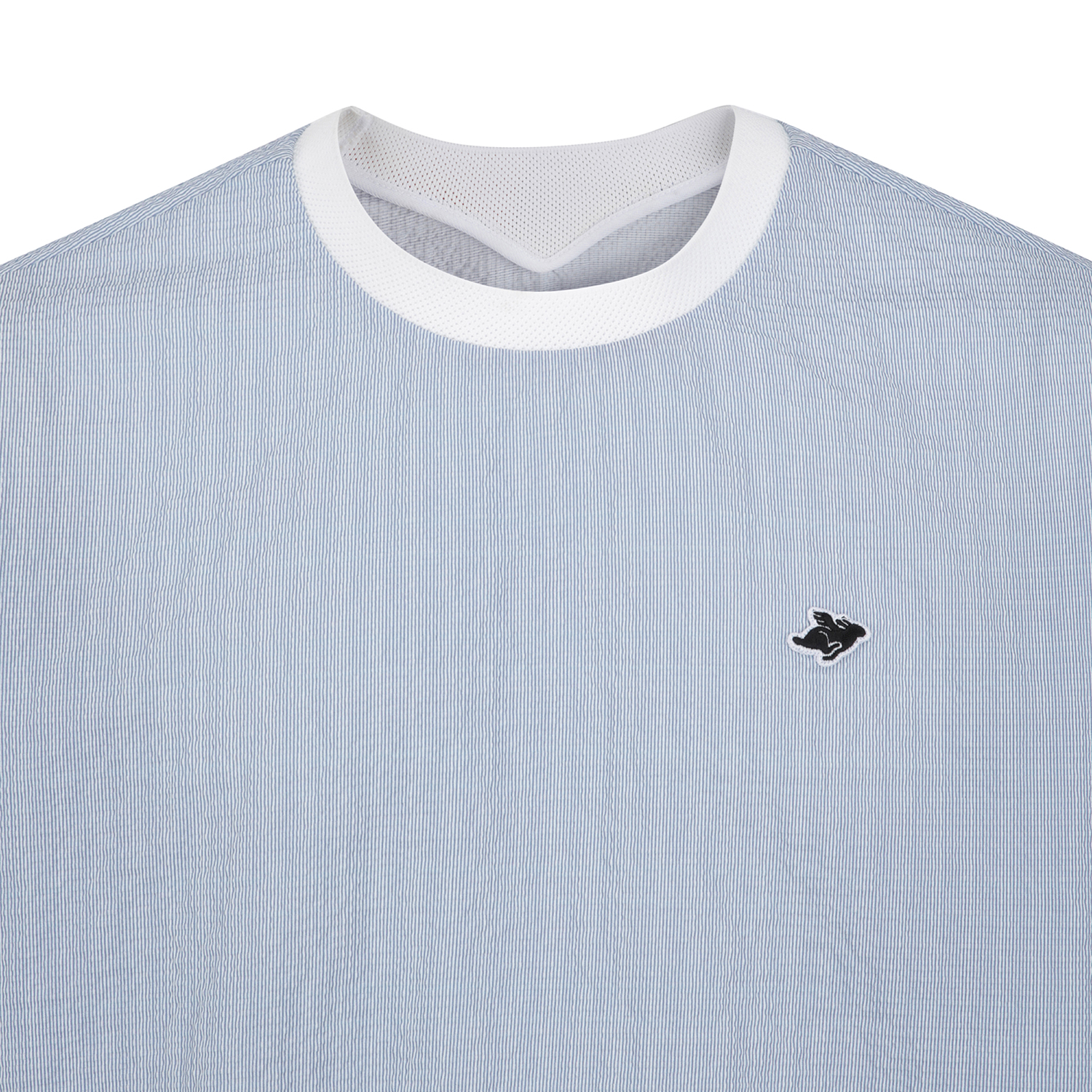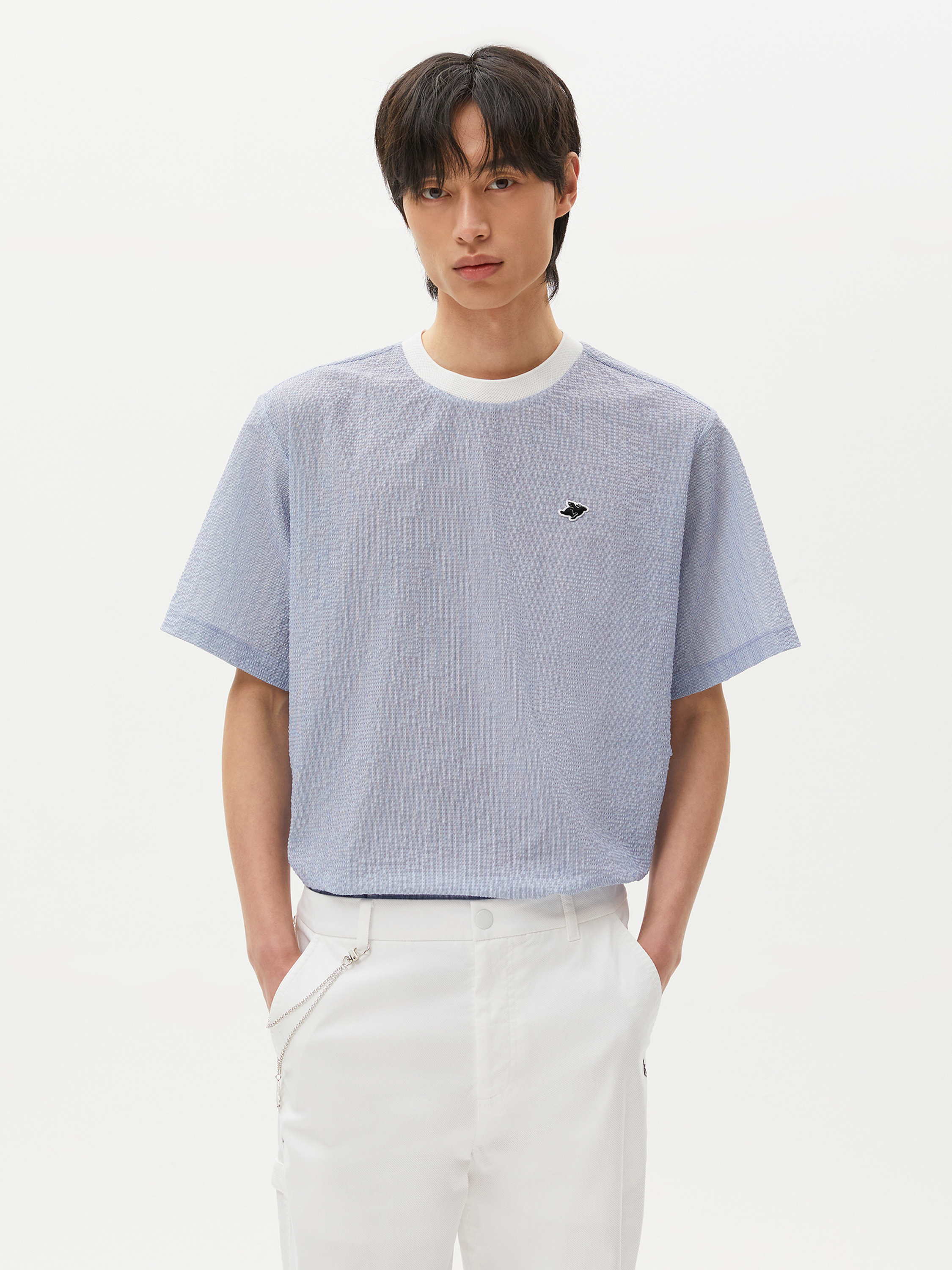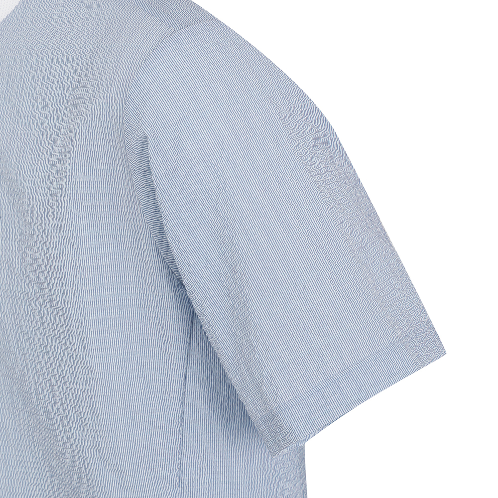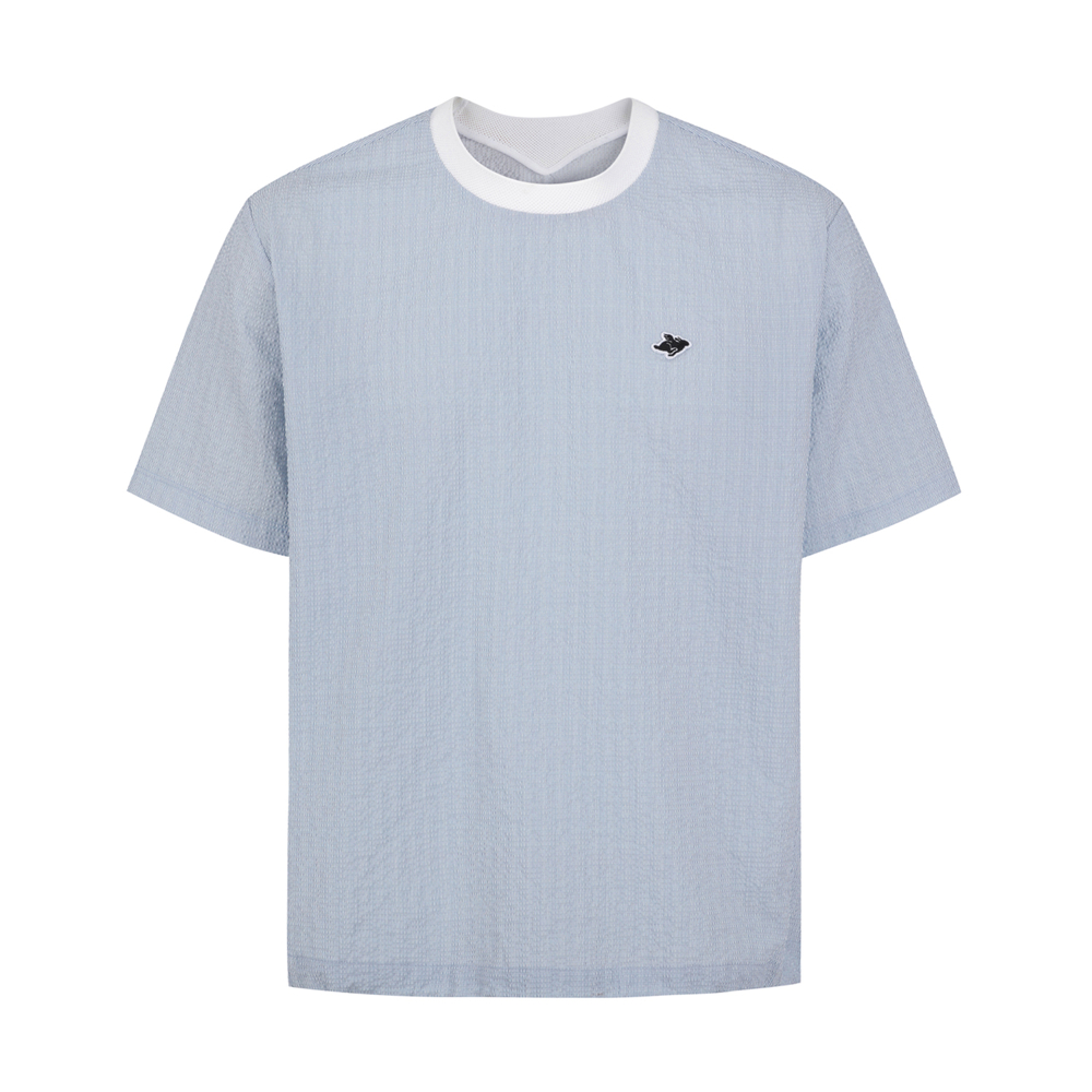 가볍고 신축성이 우수한 서커 원단에 잔잔한 세로 스트라이프를 전판에 표현한 라운드 티셔츠. 메쉬 에리로 착용감이 우수하며, 암홀 하단에 통풍이 용이하도록 벤틸기능이 있음. 밑단 조임기능이 있어 체형에 맞게 스타일 연출 가능함.