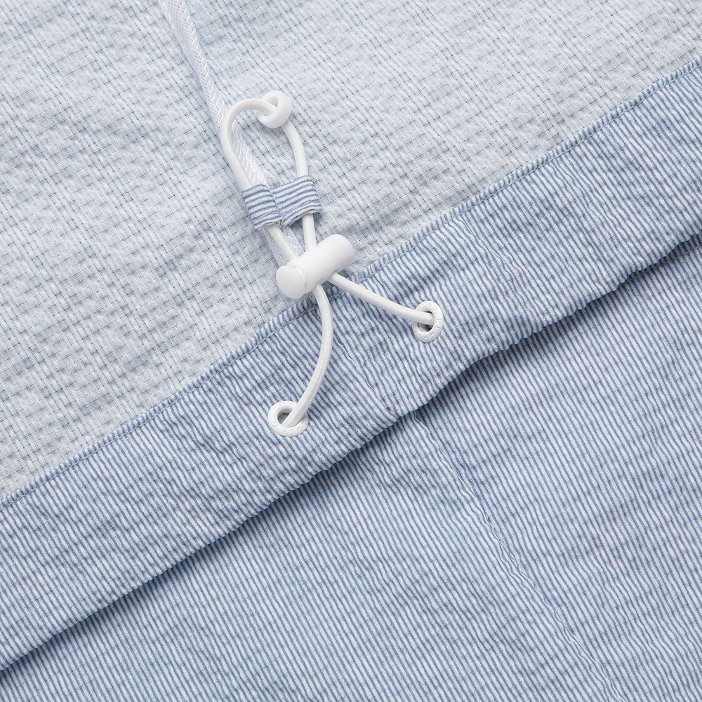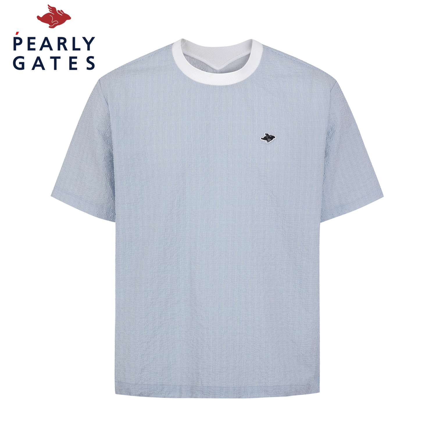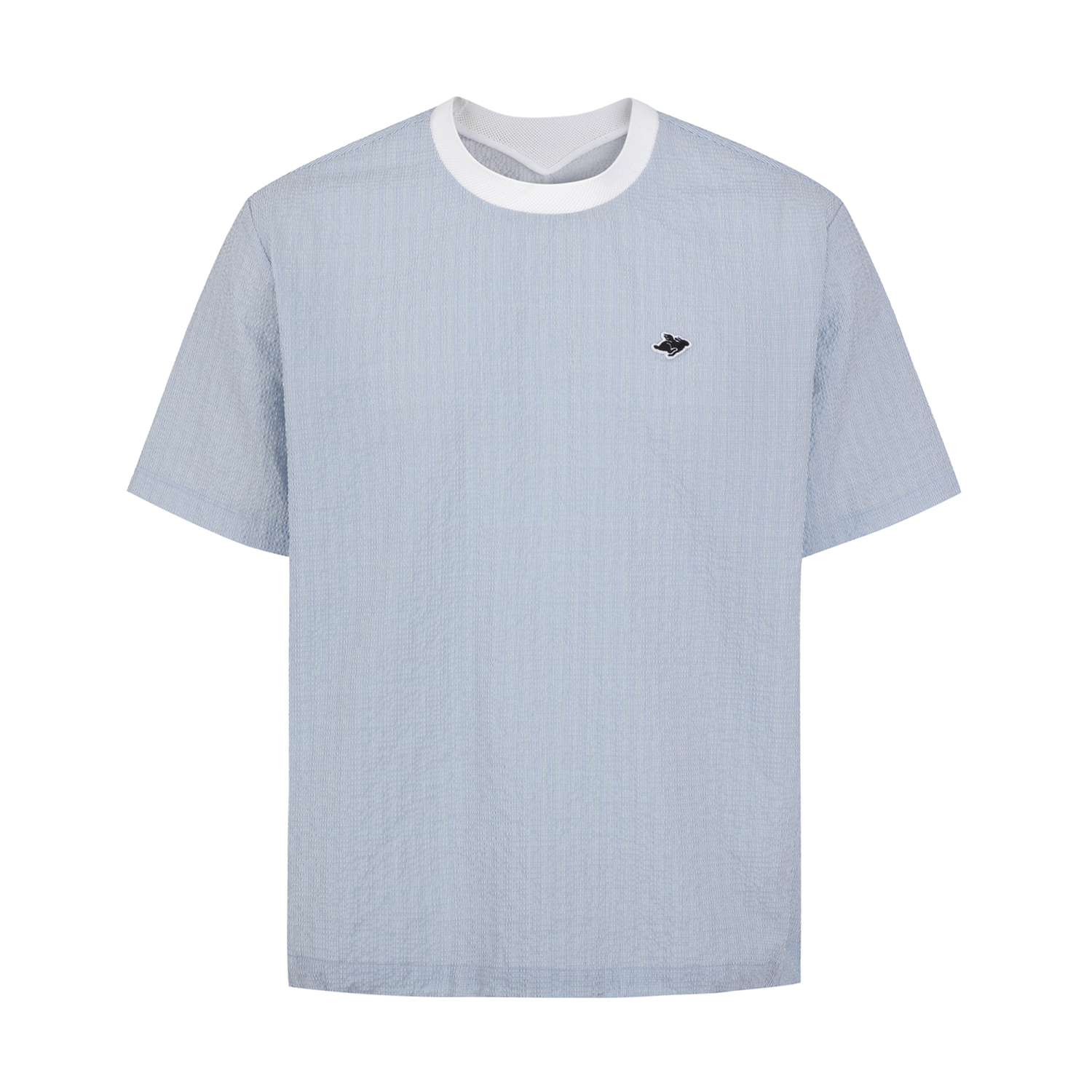 가볍고 신축성이 우수한 서커 원단에 잔잔한 세로 스트라이프를 전판에 표현한 라운드 티셔츠. 메쉬 에리로 착용감이 우수하며, 암홀 하단에 통풍이 용이하도록 벤틸기능이 있음. 밑단 조임기능이 있어 체형에 맞게 스타일 연출 가능함.