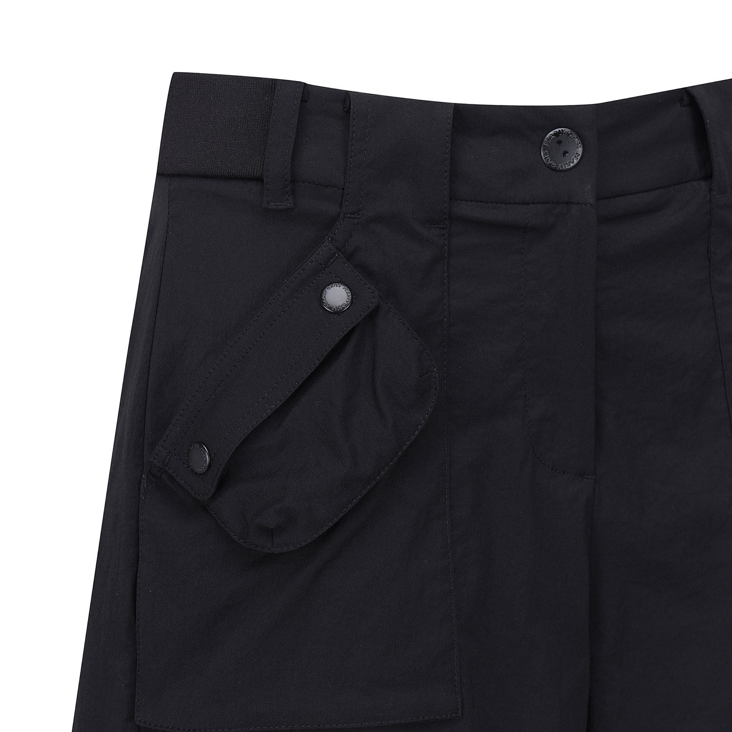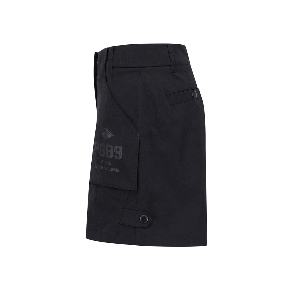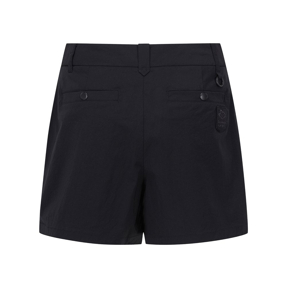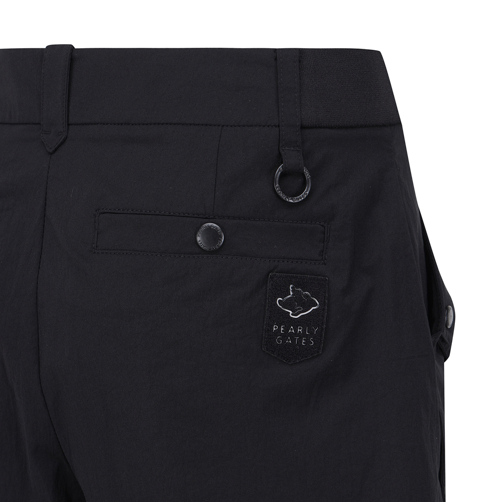 탭 단추 디테일로 유니크함을 더한 반바지.한여름에 시원하게 입을 수 있는 폴리 스판 소재.허리 양쪽 사이드 밴딩으로 편안한 착용감 제공.