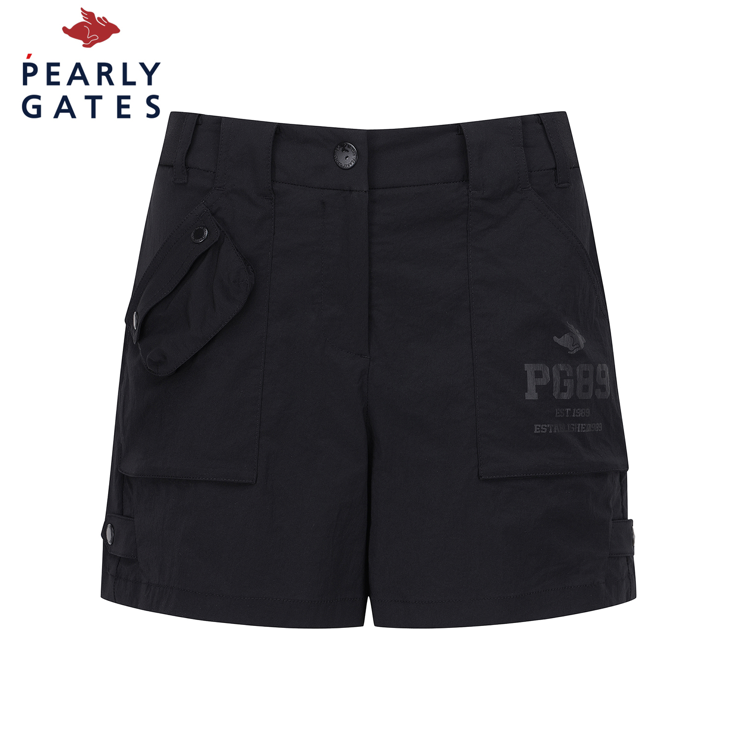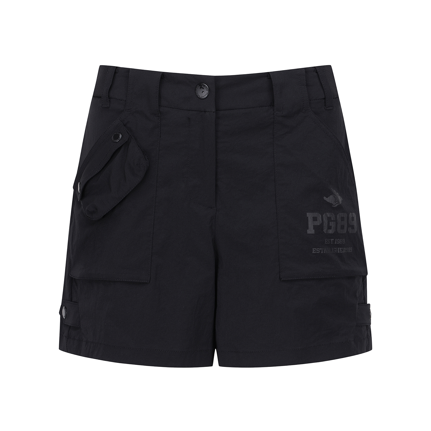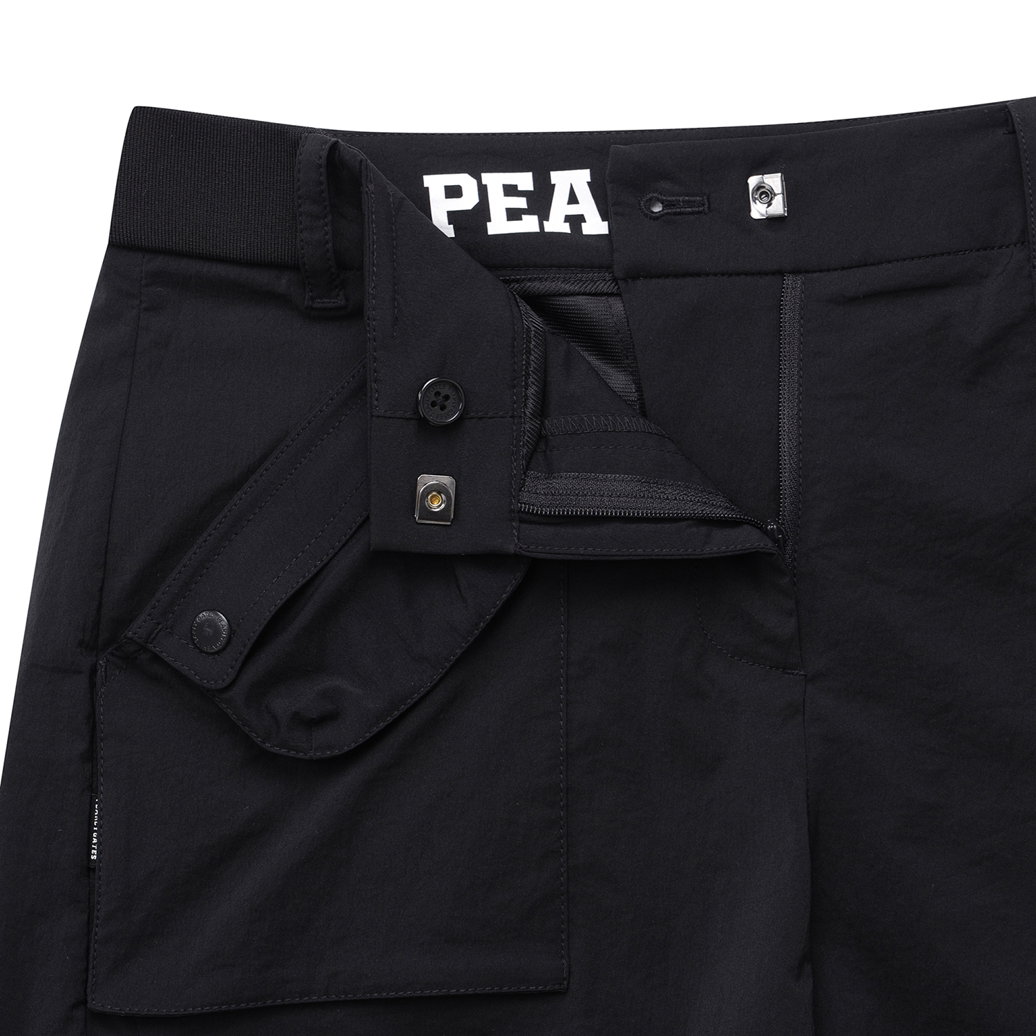탭 단추 디테일로 유니크함을 더한 반바지.한여름에 시원하게 입을 수 있는 폴리 스판 소재.허리 양쪽 사이드 밴딩으로 편안한 착용감 제공.