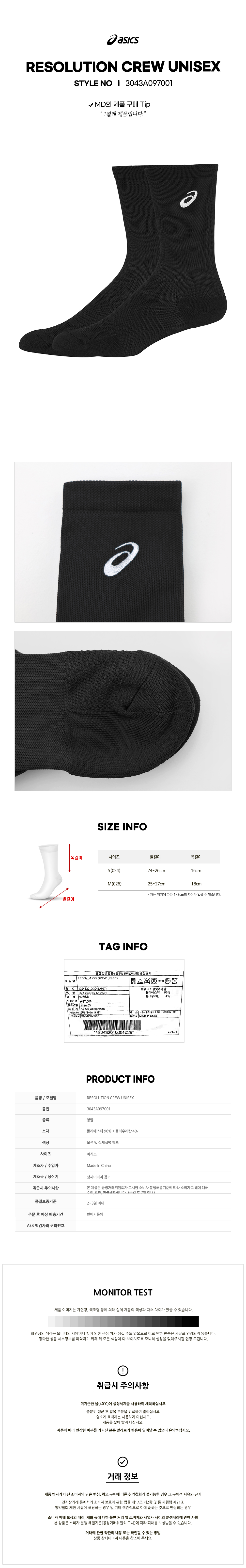 신 레졸루션 크루 삭스(3043A097001) 아식스 양말