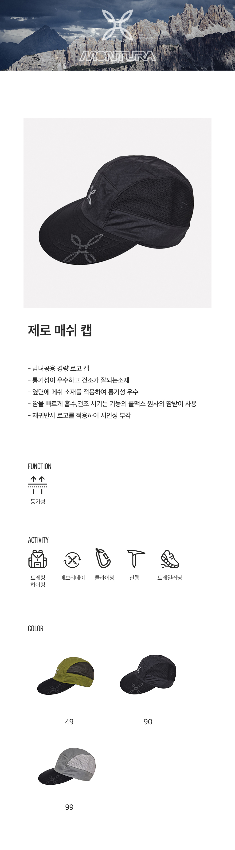 [몬츄라] 공용 러닝 등산 모자 제로 매쉬 캡 KVG07BN49