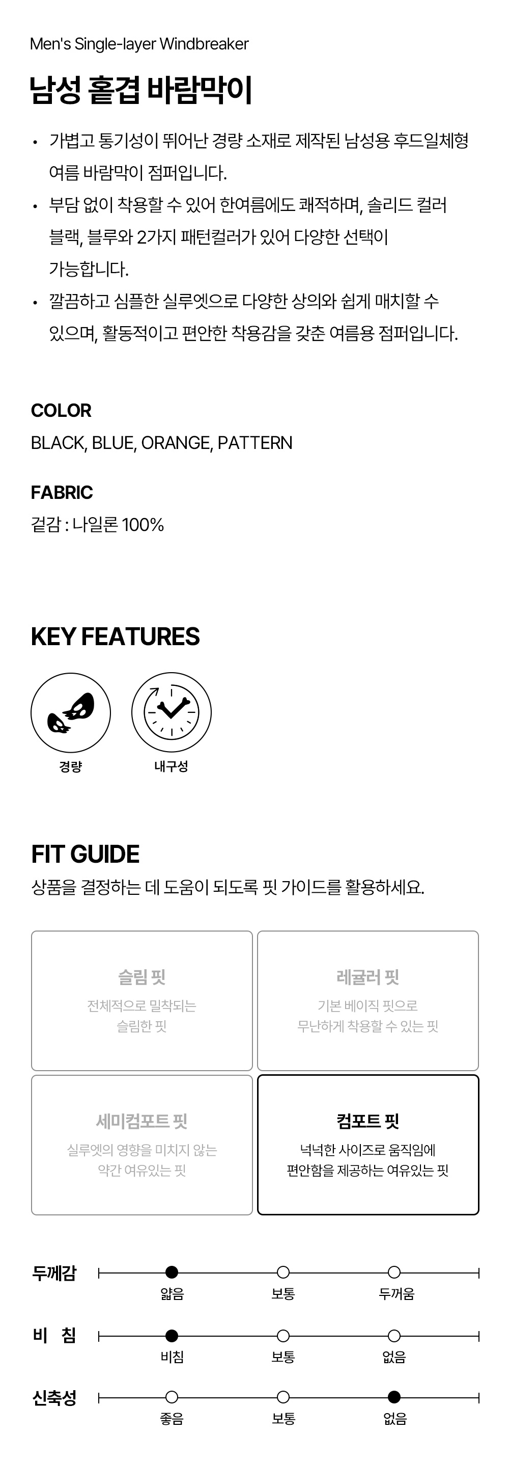 남성 홑겹 바람막이